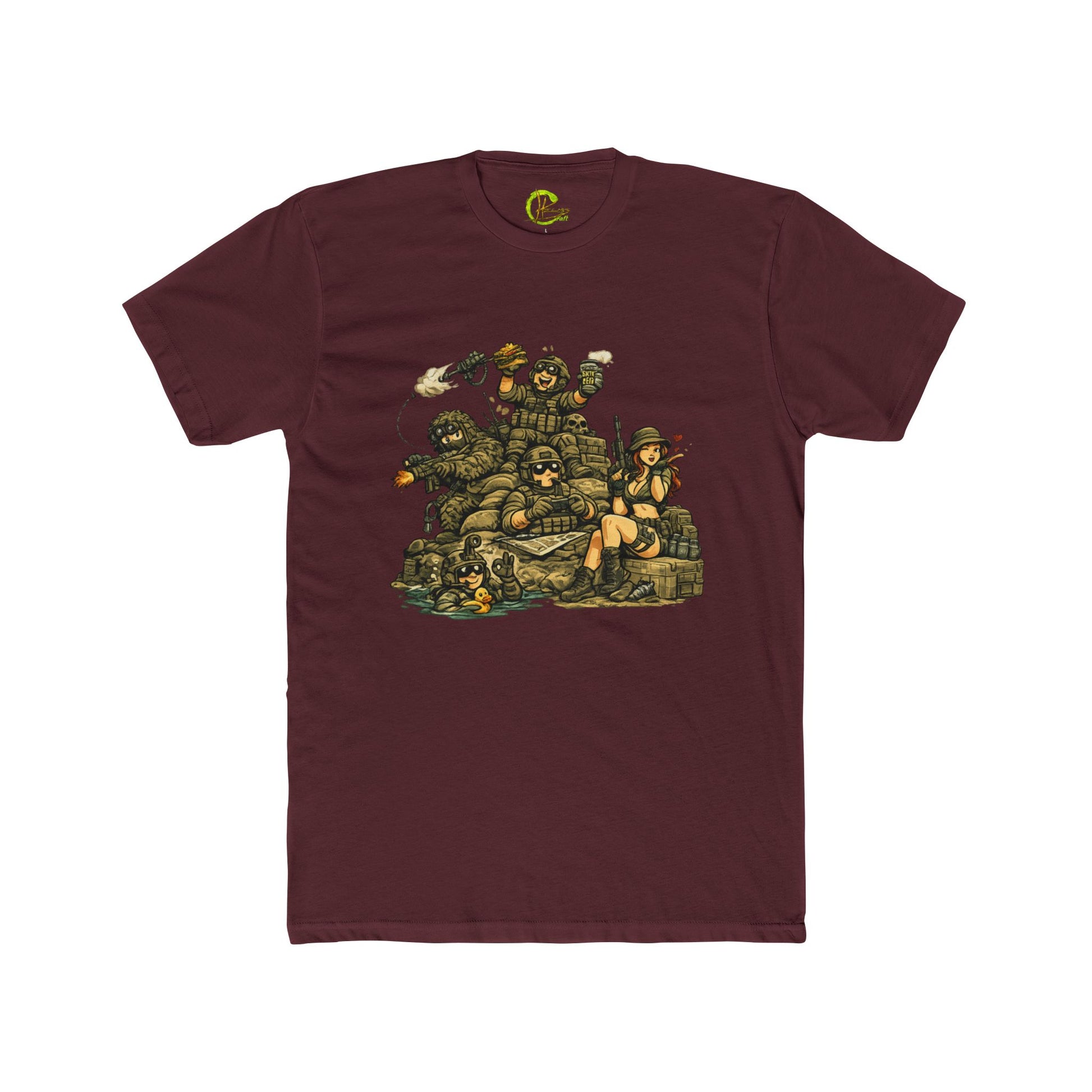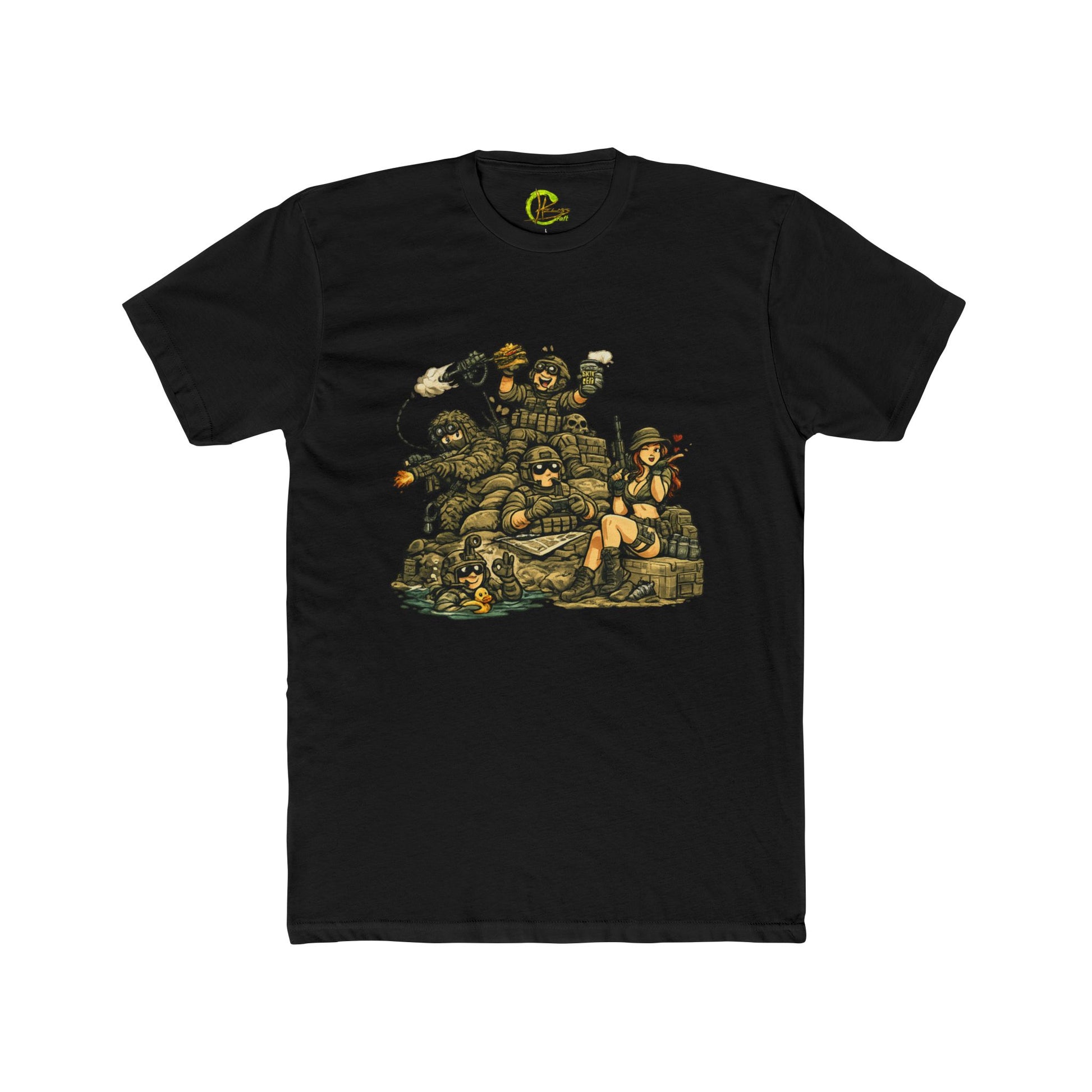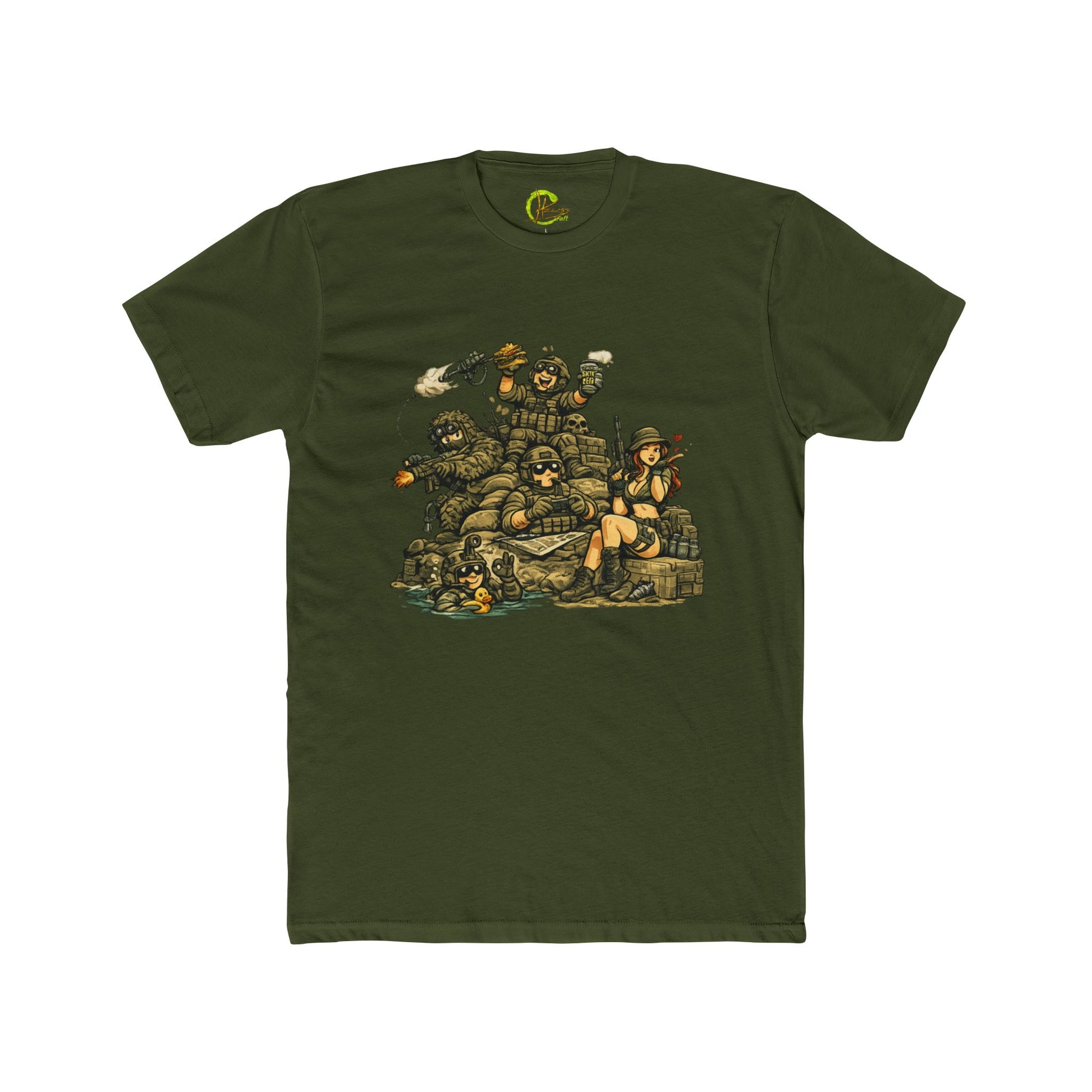 This lightweight cotton crew brings a warm, nostalgic scene to your everyday wardrobe. The front print shows a small band of rugged explorers gathered on a stack of gear — a playful mix of vintage camping vibes and comic adventure. Soft, breathable fabric sits close to the body without feeling heavy, making it comfortable through changing seasons. The classic crew neckline and clean side seams create a neat silhouette that layers easily under jackets or wears alone with worn denim. Sleeve artwork applied with DTF printing keeps the details crisp and textured, while shoulder tape and a ribbed collar help the tee hold its shape wash after wash. It carries a lived-in, storybook energy that suits quiet trail afternoons, campfire nights, or casual meetups with fellow outdoorsy friends.