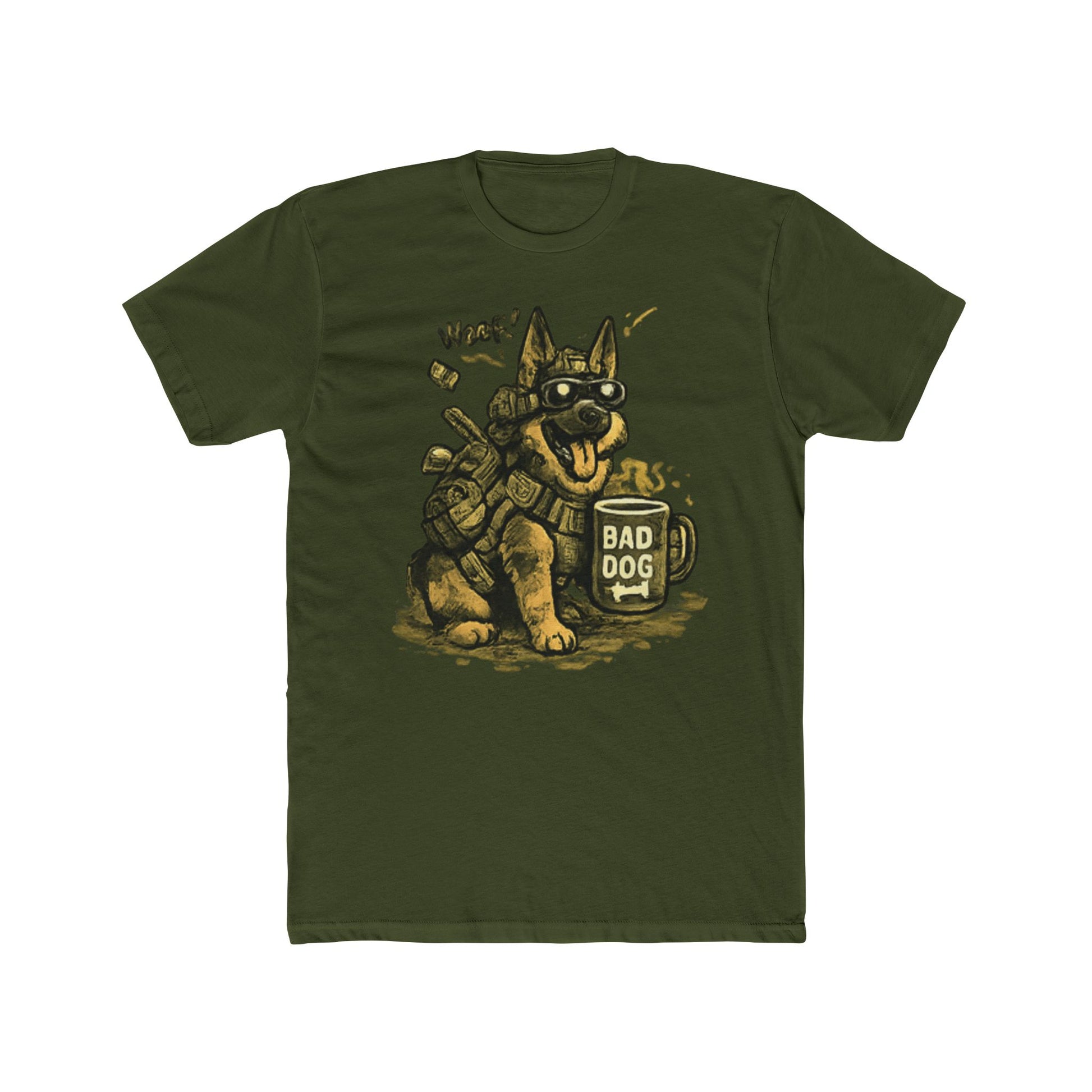This image features a cartoon-style illustration of a mischievous dog character with pointed ears, exaggerated features, and a playful expression wearing oversized glasses. The dog is depicted in a retro pixel art or vintage engraving style with detailed line work and shading throughout its muscular, anthropomorphic body. Next to the character sits a ceramic mug labeled "BAD DOG" that the character appears to be holding or presenting. The illustration includes scattered elements around the main figure, suggesting movement or chaos, which complements the "bad dog" theme. The overall aesthetic combines classic cartoon aesthetics with a humorous, slightly edgy personality perfect for merchandise or novelty branding.