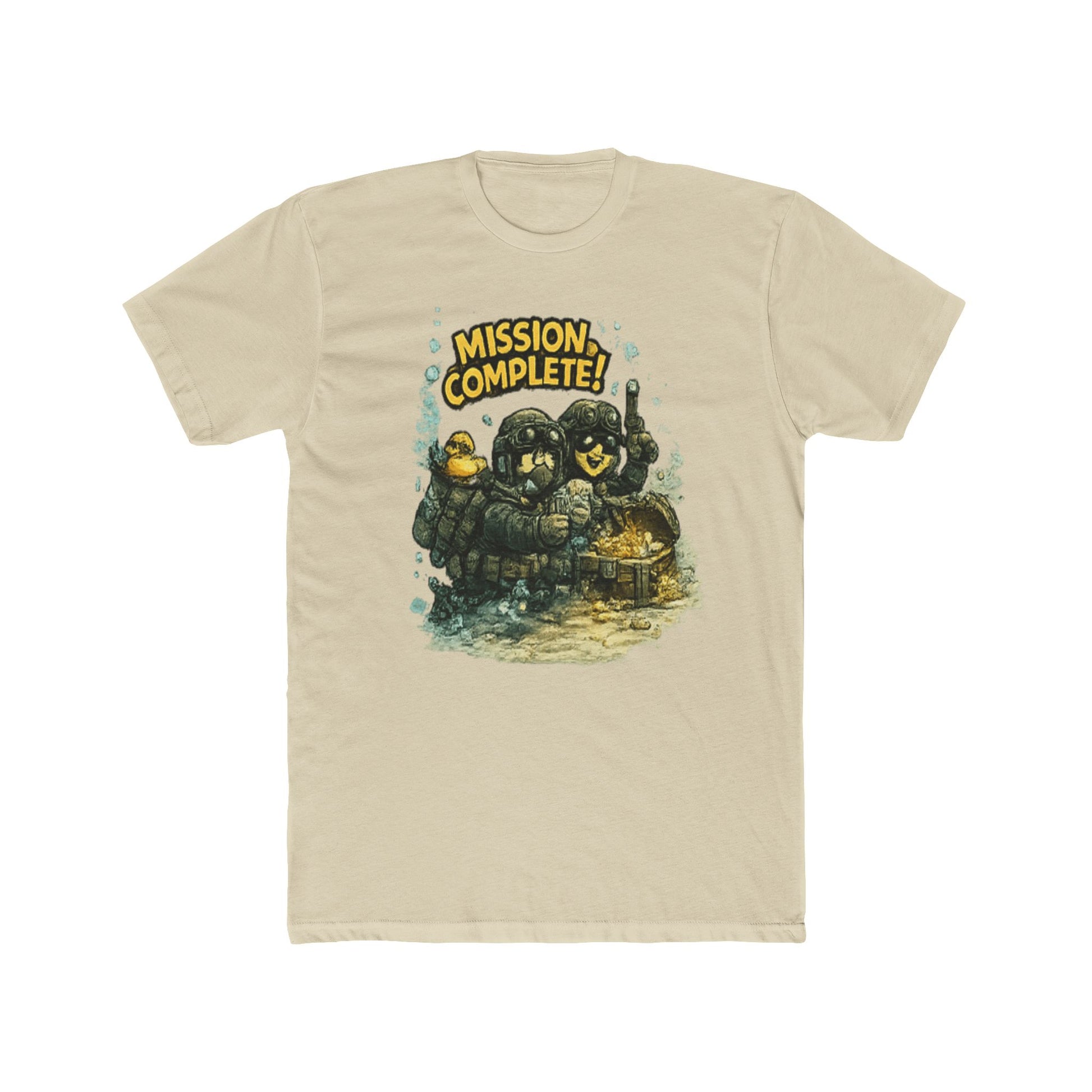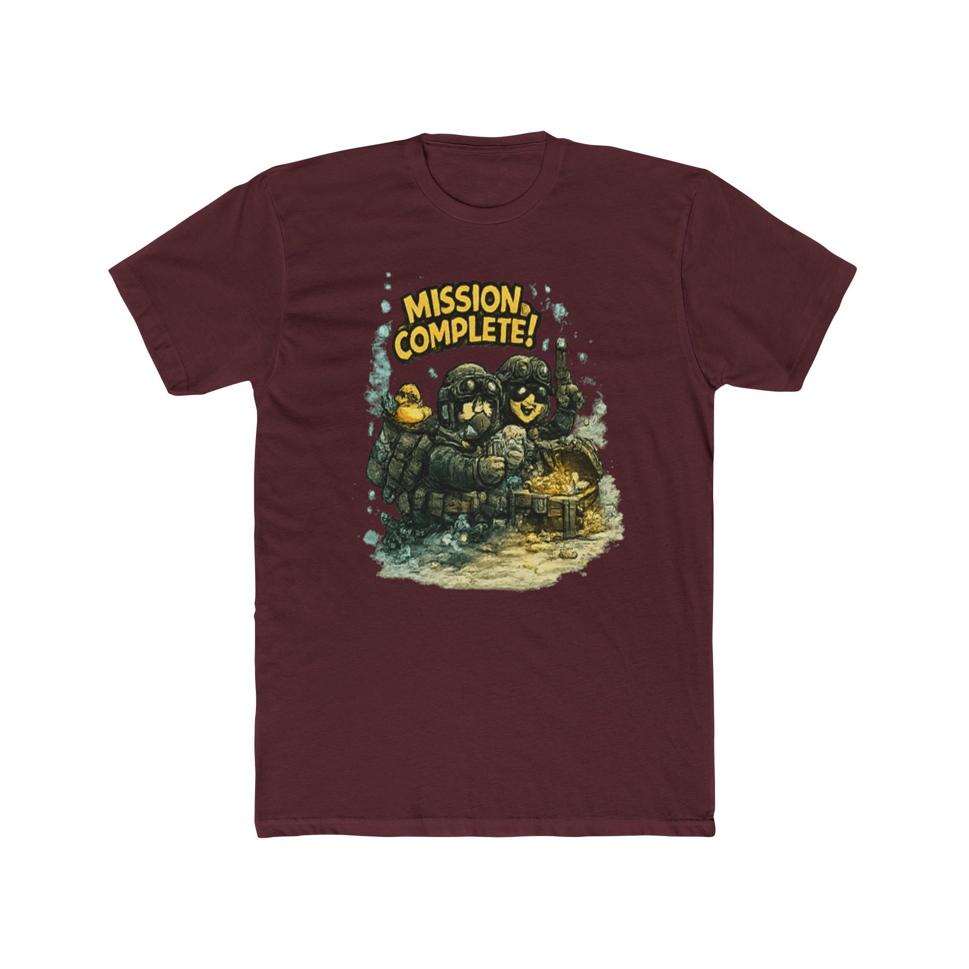 This image features a retro video game screen displaying a "Mission Complete" message in bold, pixelated text at the top. The composition showcases a group of cartoon characters dressed in military or tactical gear, standing together in a celebratory pose. The art style is characteristic of 8-bit or 16-bit era video games, with chunky pixels and sprite-based graphics typical of classic gaming platforms. The scene includes environmental elements such as a treasure chest and rocky terrain that suggest an adventure or action-based gameplay setting. The overall aesthetic captures the nostalgic charm of vintage arcade and console games from the 1980s and 1990s.