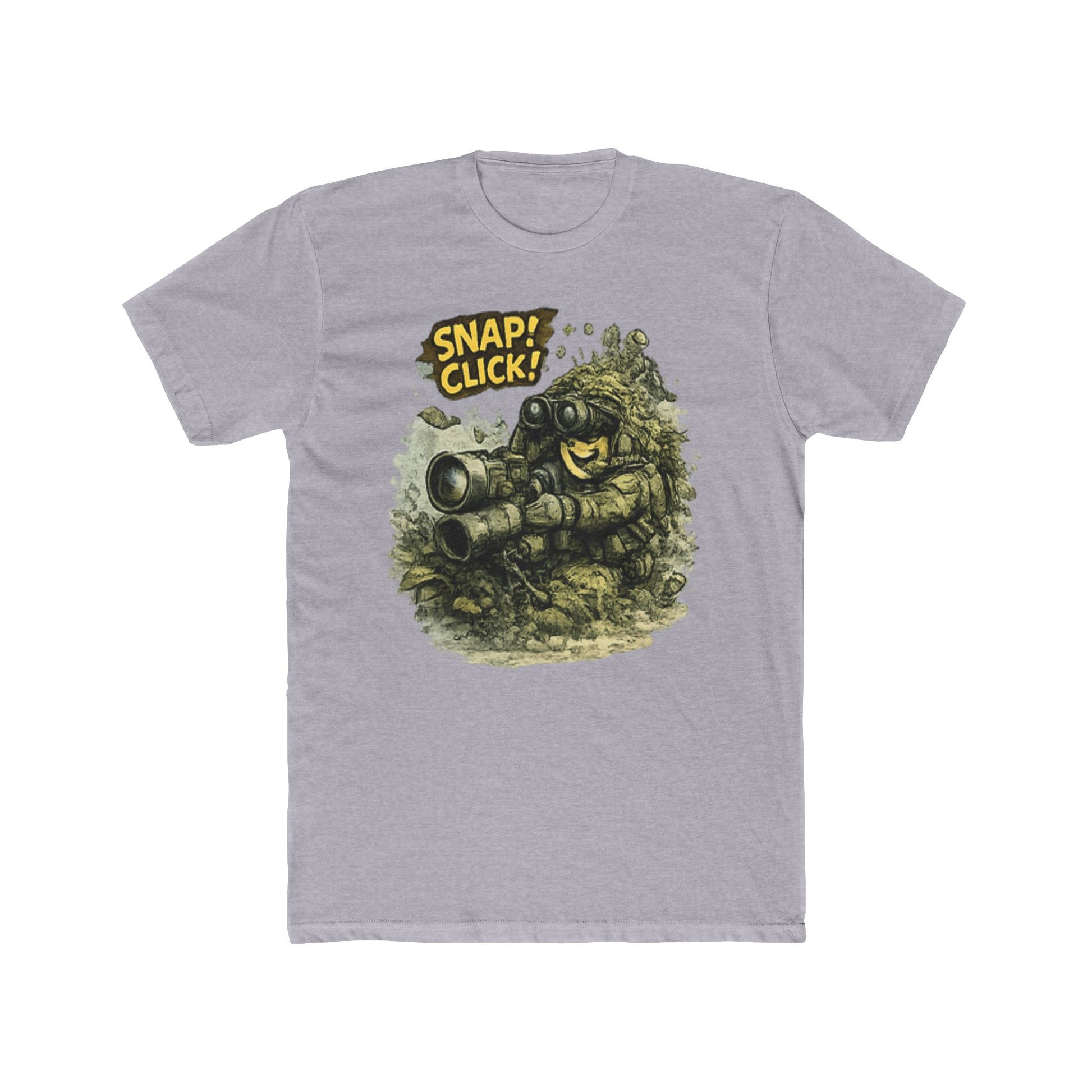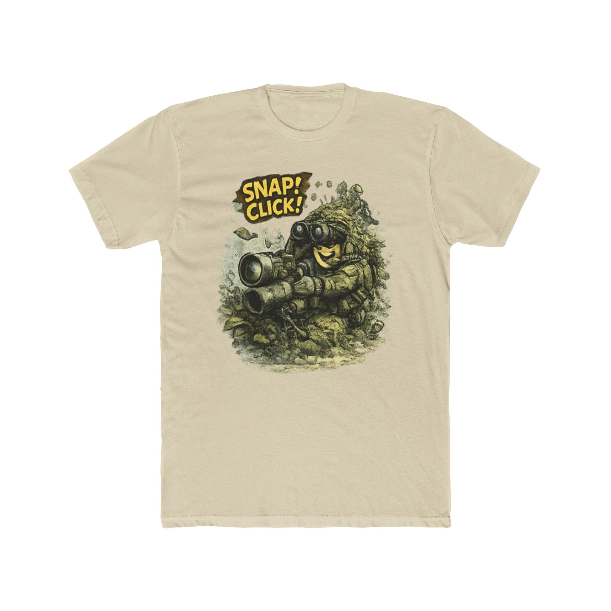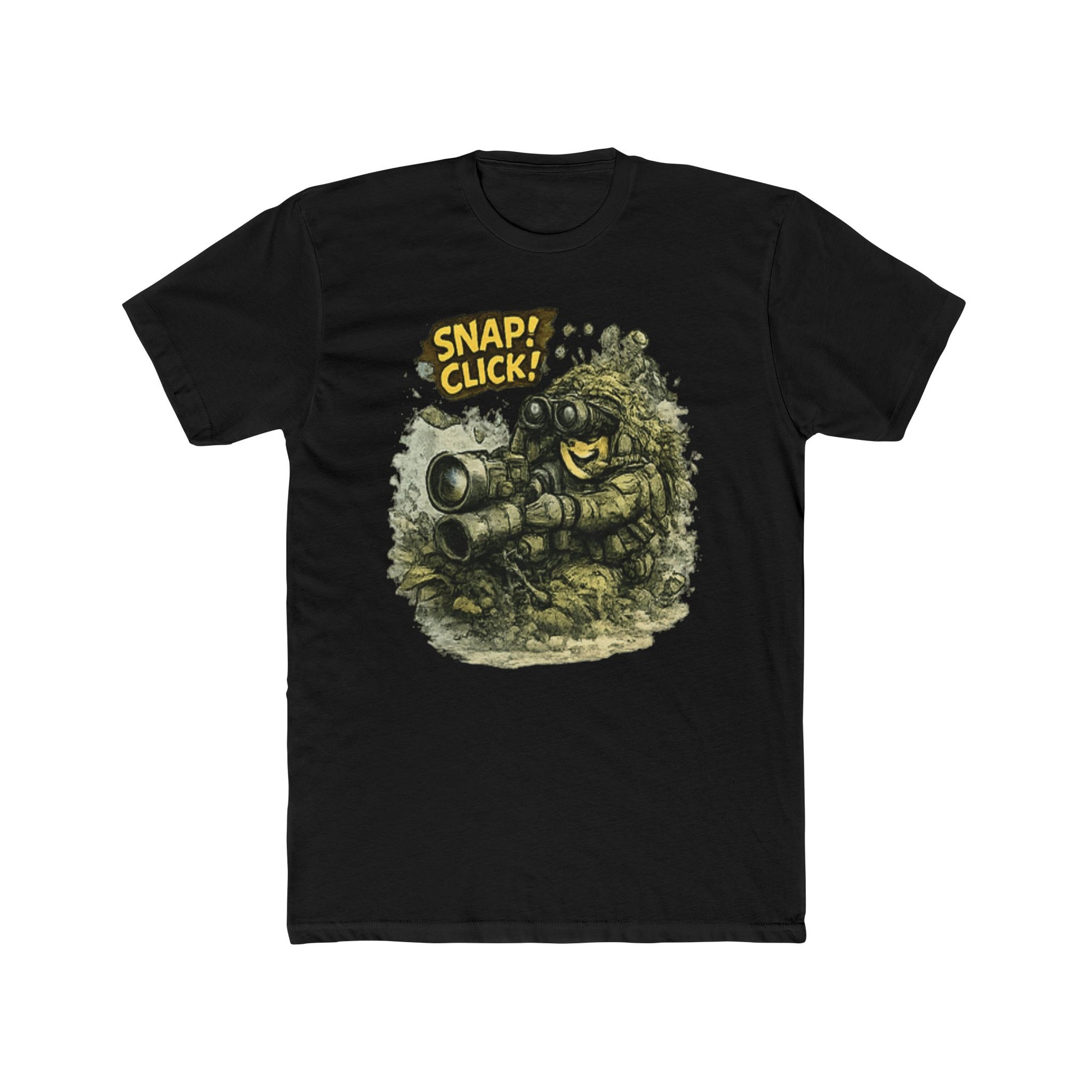 This retro pixel art illustration features a cartoonish character holding a camera with an exaggerated smile and wide eyes, positioned against a textured, rocky terrain backdrop. The character displays a cheerful, enthusiastic expression with prominent facial features rendered in a classic 8-bit or 16-bit video game style. Bold yellow text reading "SNAP! CLICK!" appears at the top of the image, emphasizing the photography theme. The overall composition combines nostalgic gaming aesthetics with humorous character design, creating a playful visual that celebrates photography and vintage digital art. The detailed pixelated environment and character proportions are characteristic of early console gaming graphics.