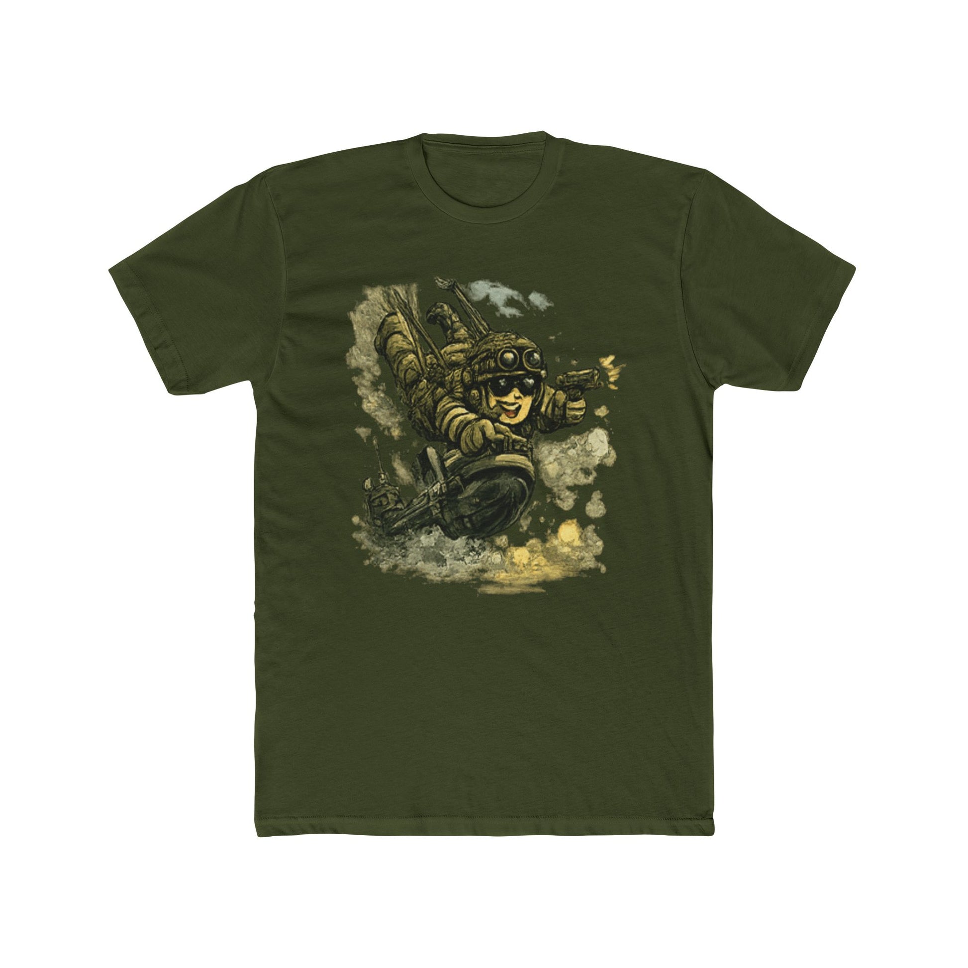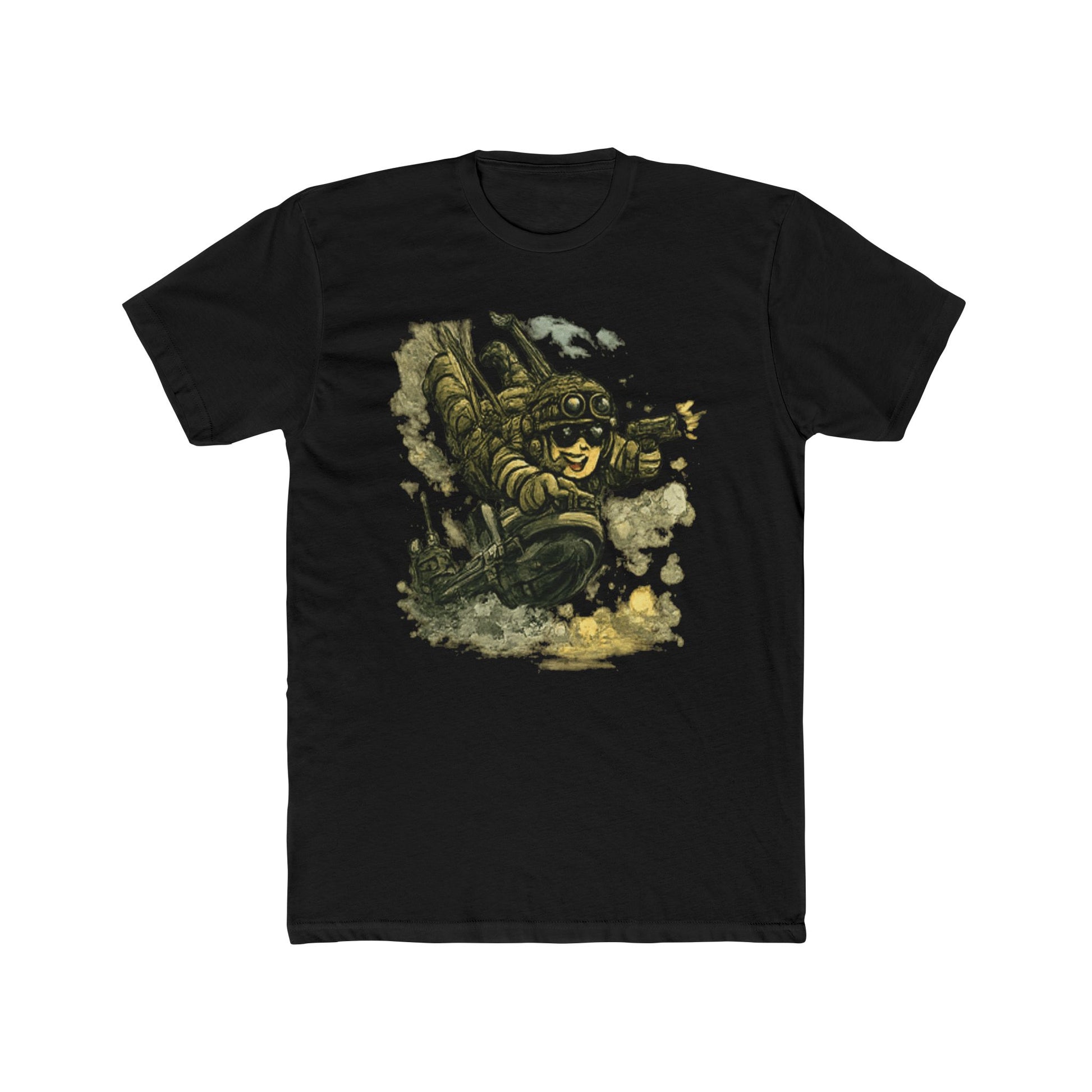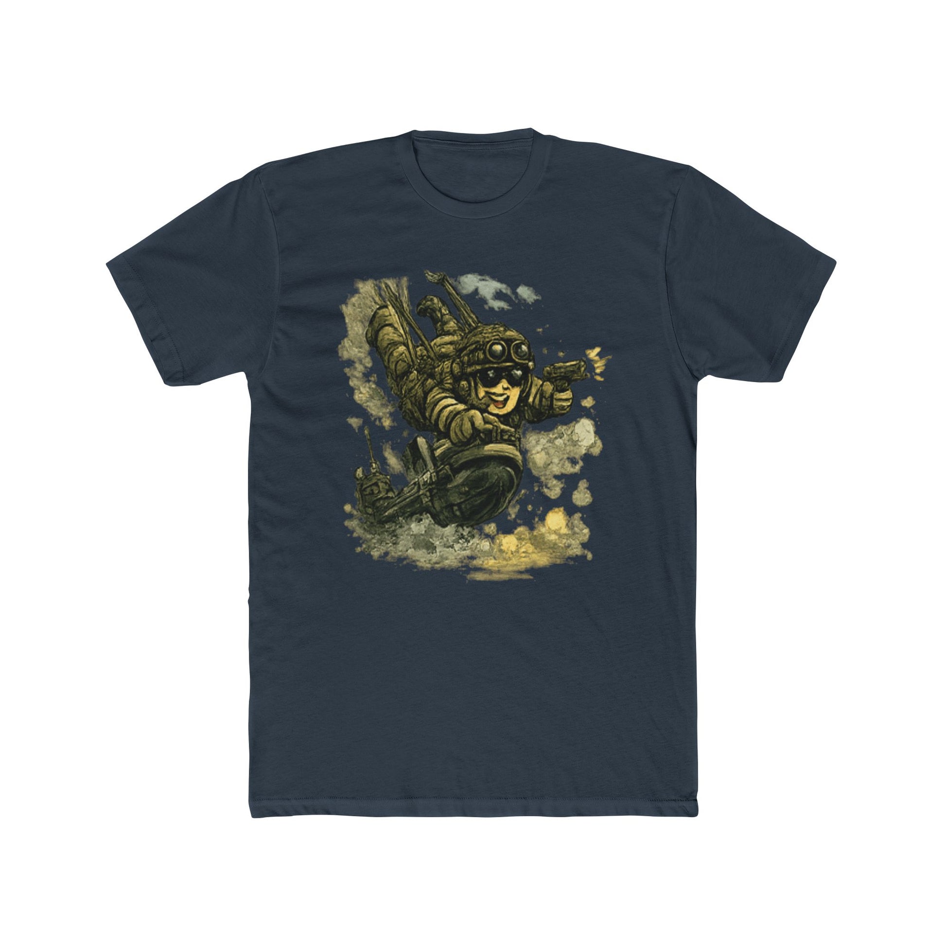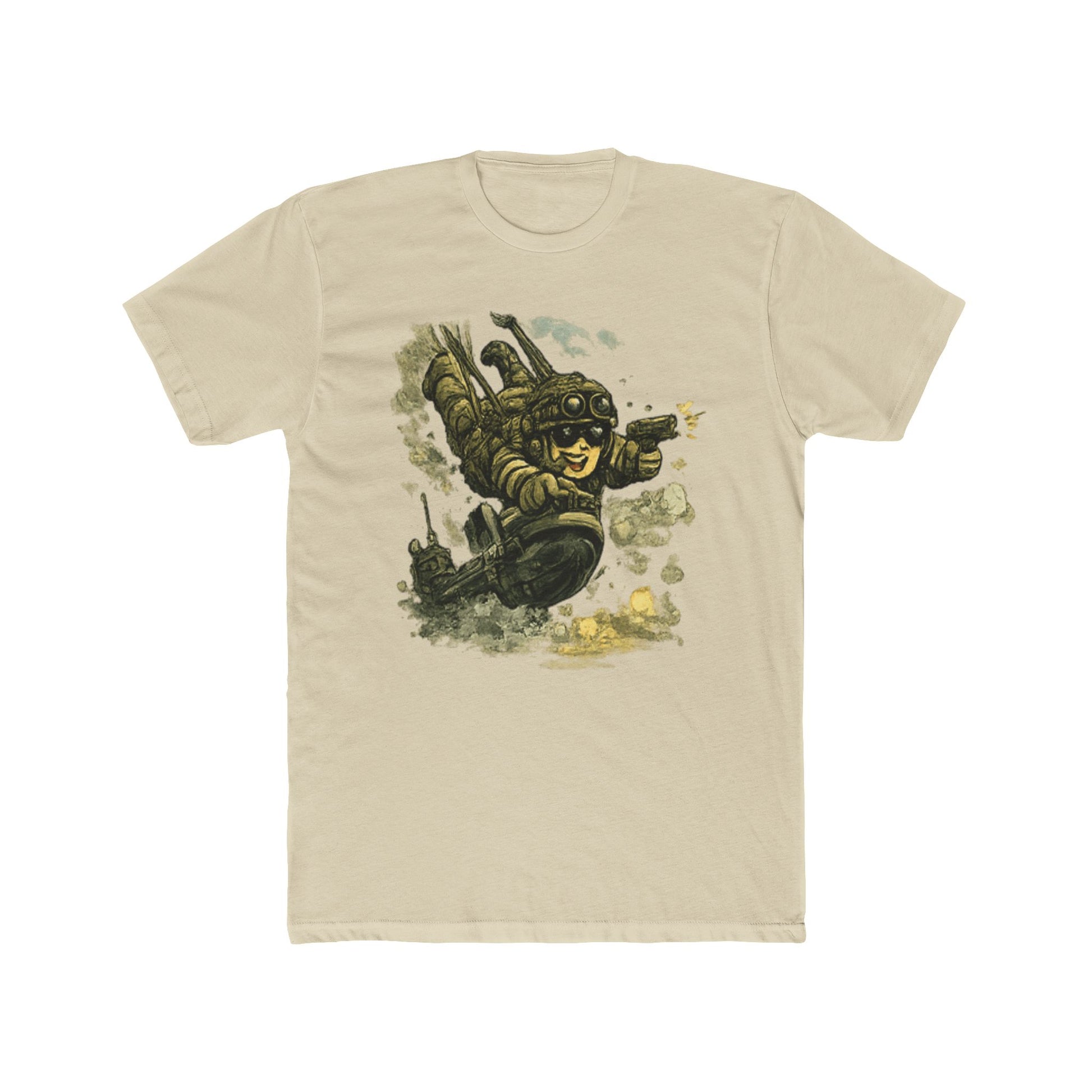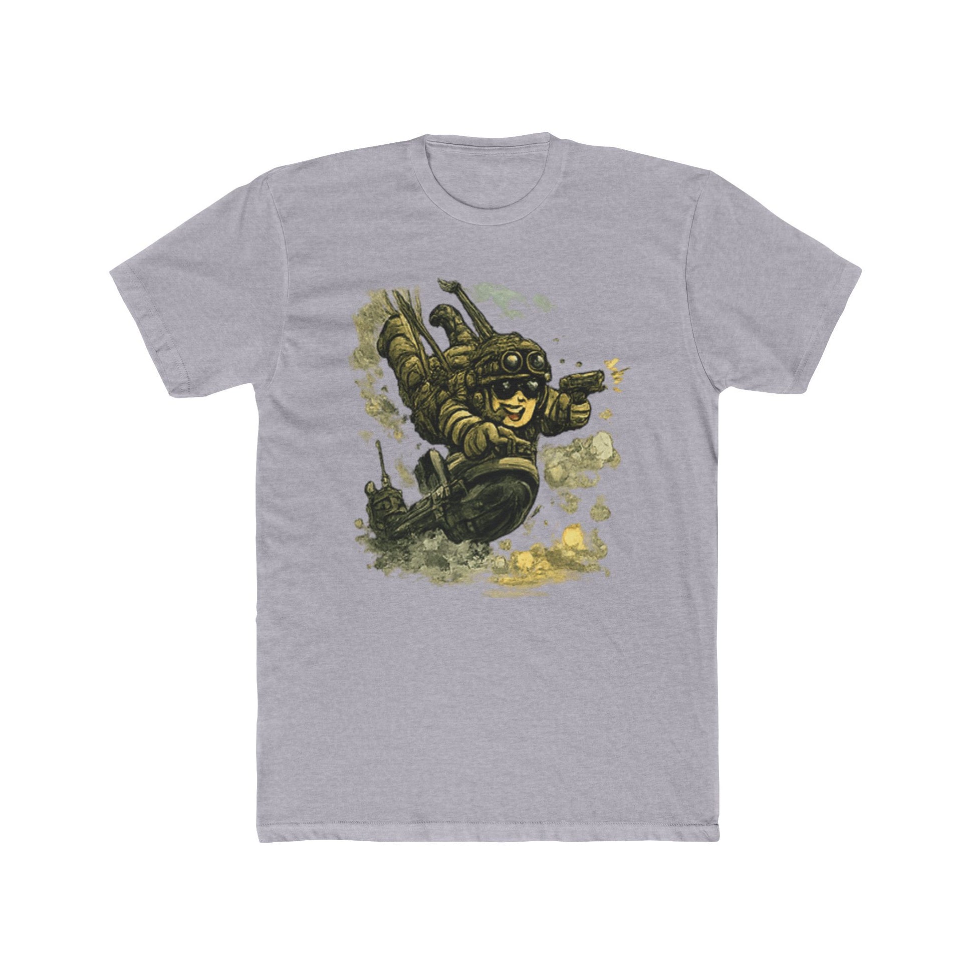 This retro pixel art illustration depicts a cheerful character wearing goggles and a helmet with large mechanical tentacle-like appendages extending from their head. The figure displays an exuberant expression with a wide smile and appears to be in an action-oriented pose with arms outstretched. The artwork showcases a vintage video game aesthetic reminiscent of early gaming consoles, featuring blocky pixelated details and hand-drawn outlines. Surrounding the central character are scattered cloud-like puffs and debris, suggesting movement or an explosive action scene. The overall composition emphasizes a steampunk or sci-fi inspired design with industrial mechanical elements combined with a playful, whimsical character portrayal.
