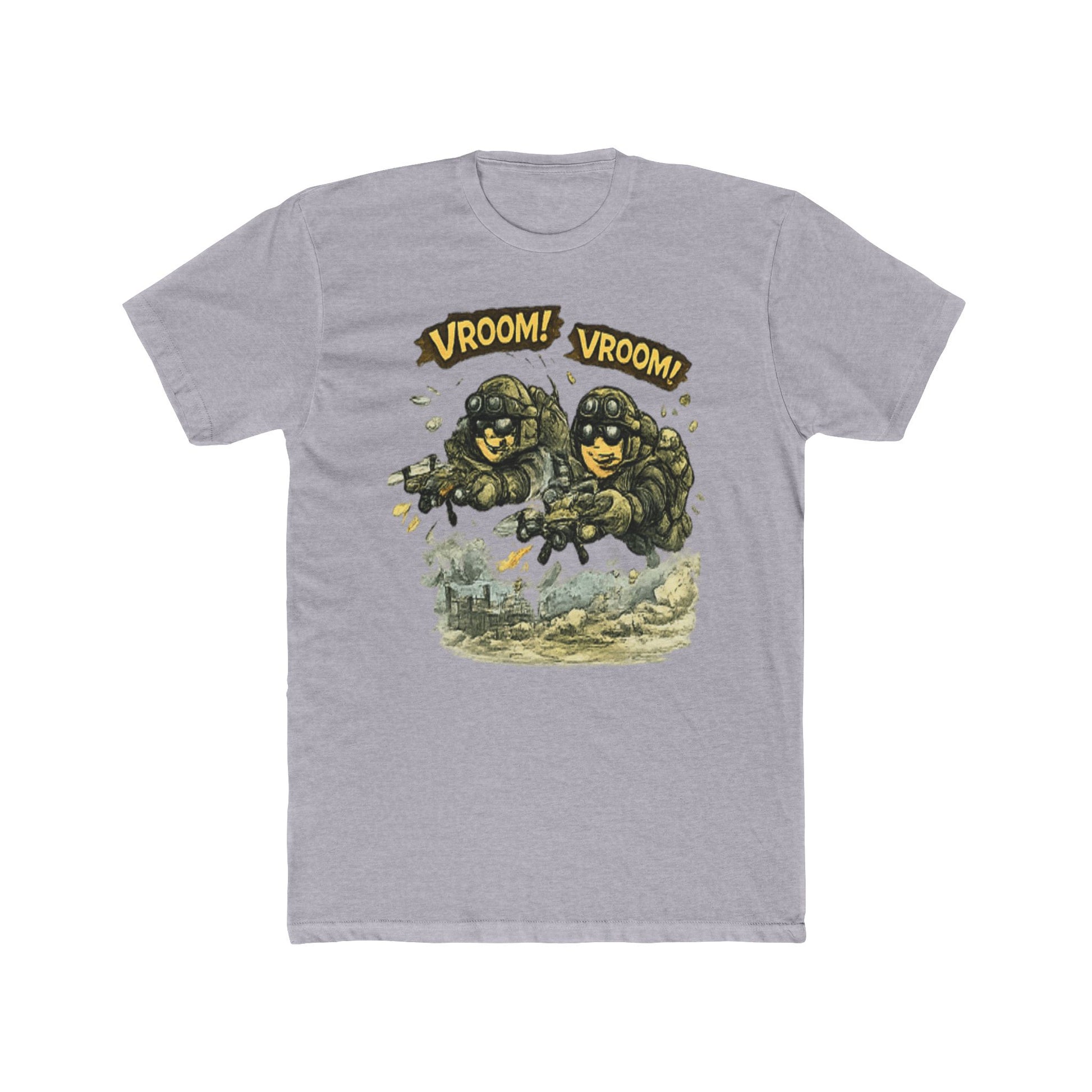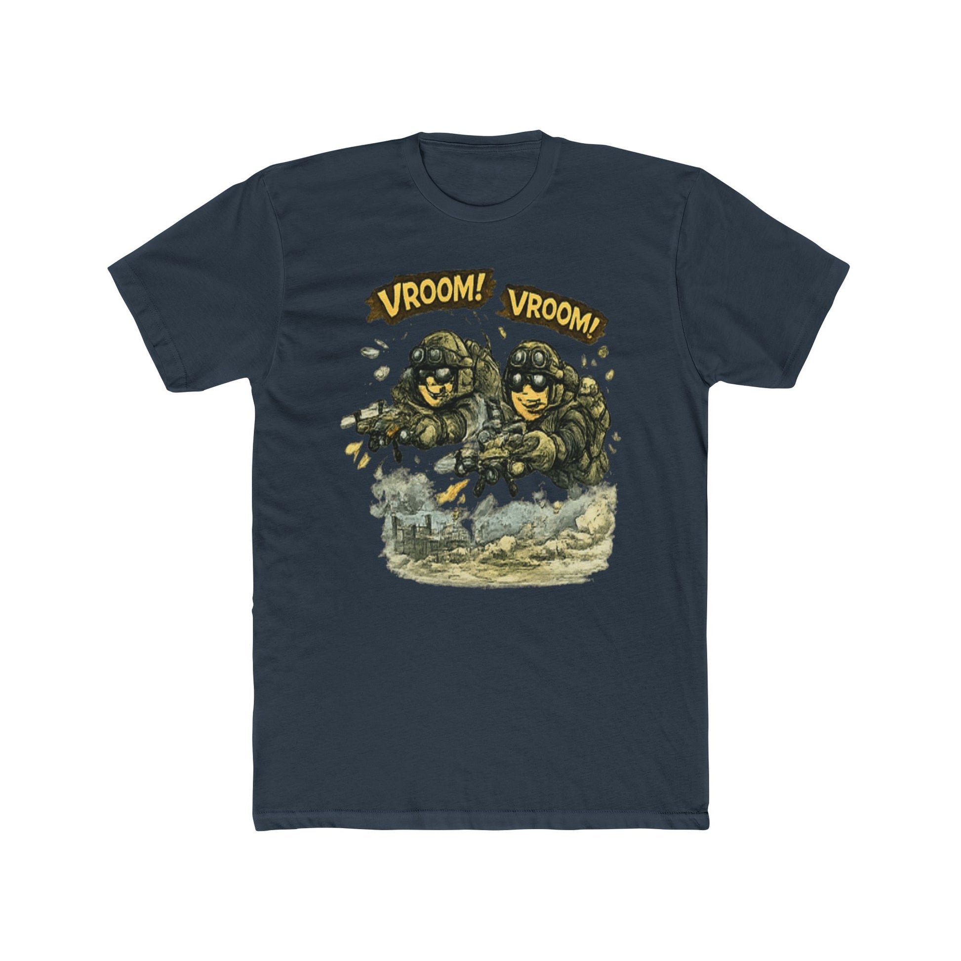 This pixelated, 8-bit style image depicts two armored soldiers in tactical gear engaged in combat operations on a desert terrain. Both figures wear protective sunglasses and heavy military equipment, with the left soldier firing a weapon while the right soldier strikes an aggressive pose. The illustration features classic video game aesthetics reminiscent of 1990s arcade games, with "VROOM! VROOM!" text displayed prominently at the top in bold lettering. The scene includes scattered rocks and debris across sandy ground, creating an authentic battlefield environment. This retro gaming artwork exemplifies the distinctive sprite-based graphics style characteristic of early action-oriented video game design.