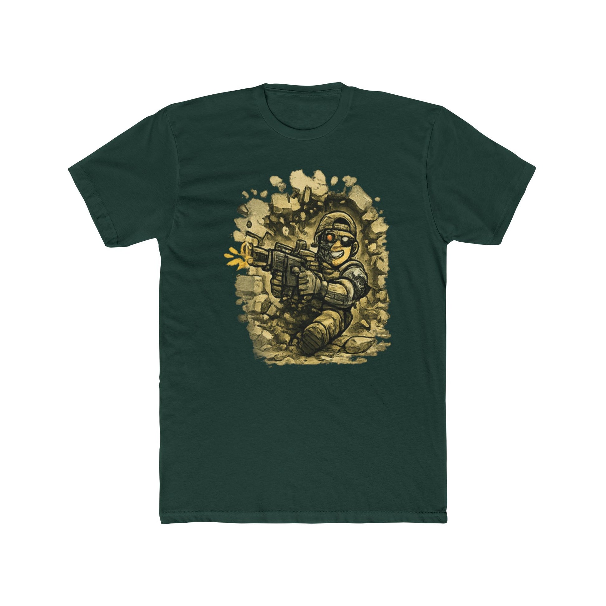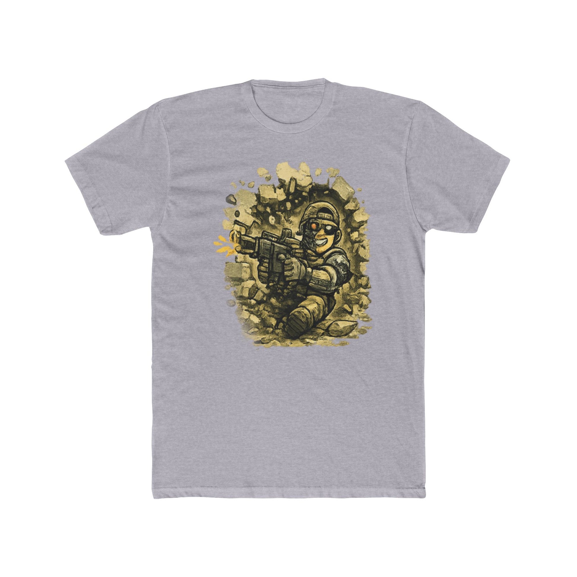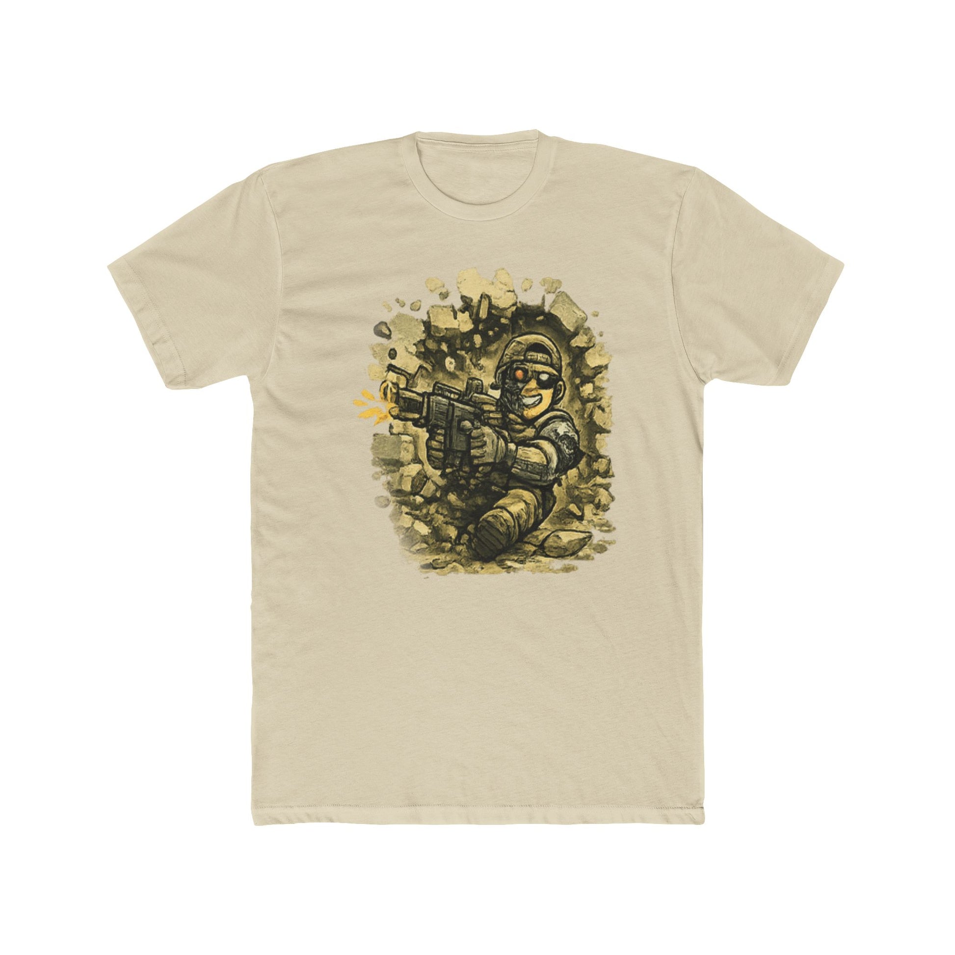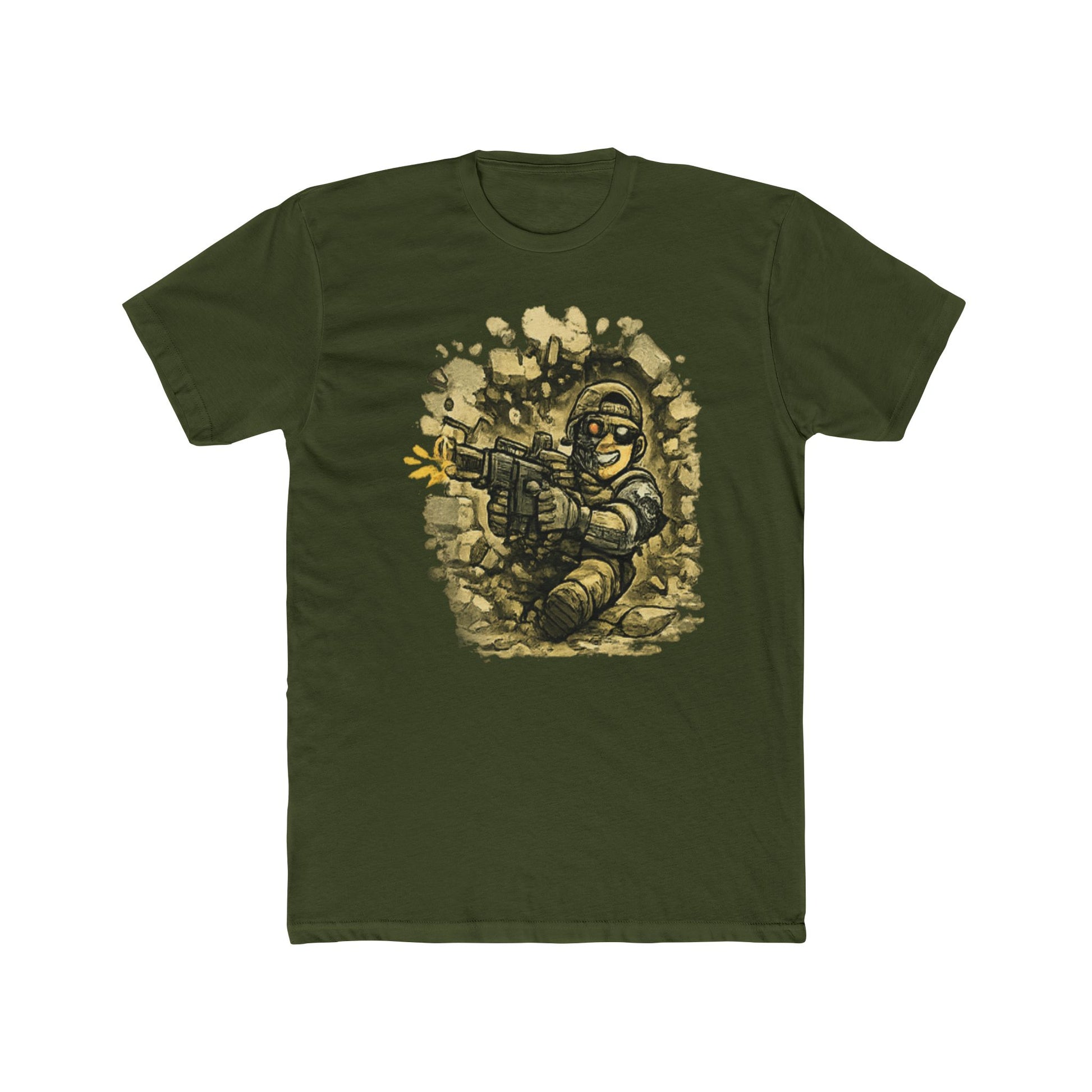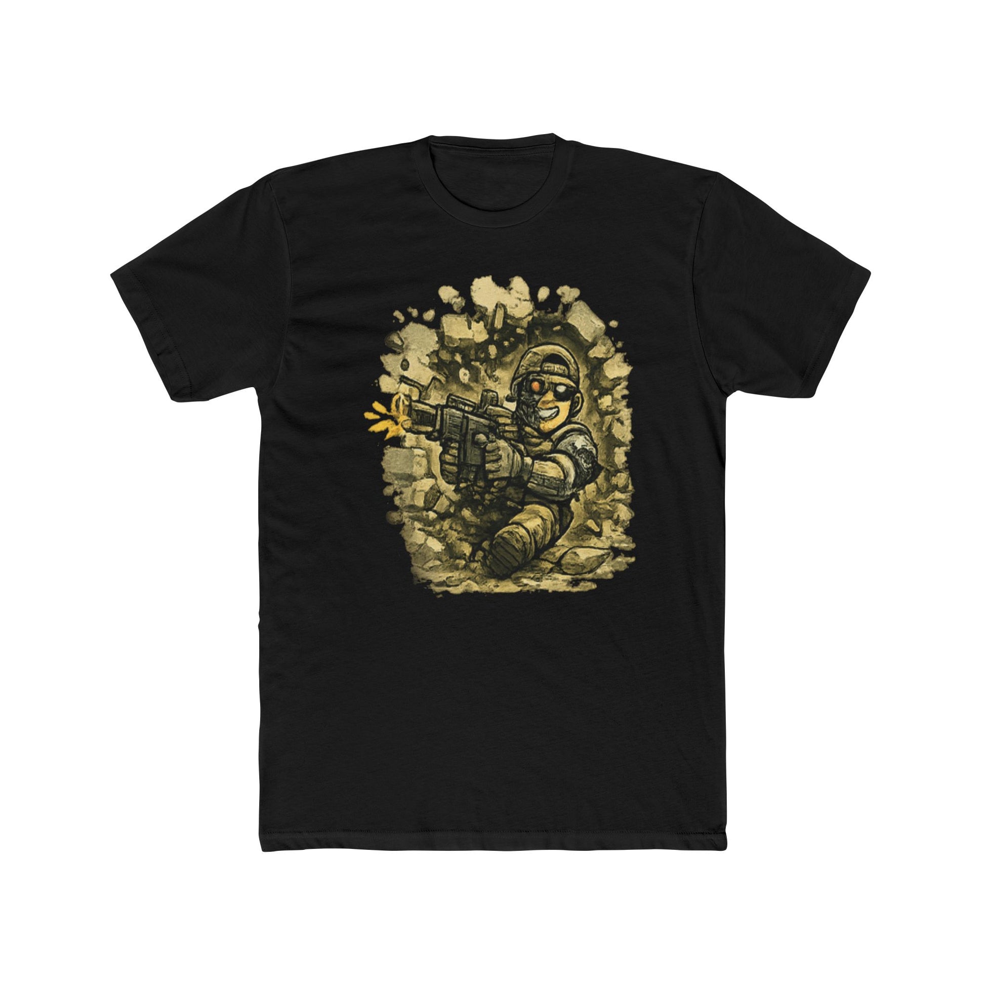 This image depicts a stylized cartoon soldier character rendered in a retro pixel art or vintage illustration style. The figure is shown in a dynamic pose, wielding a rifle with both hands while appearing to fire a weapon with an explosive effect visible on the left side. The soldier wears military attire including a helmet, boots, and tactical gear, all outlined with bold white strokes characteristic of classic comic or video game artwork. The background features scattered rocky or debris elements that create a warzone or combat environment setting. The overall aesthetic suggests this artwork draws inspiration from classic video games, comic books, or nostalgic military-themed illustrations.