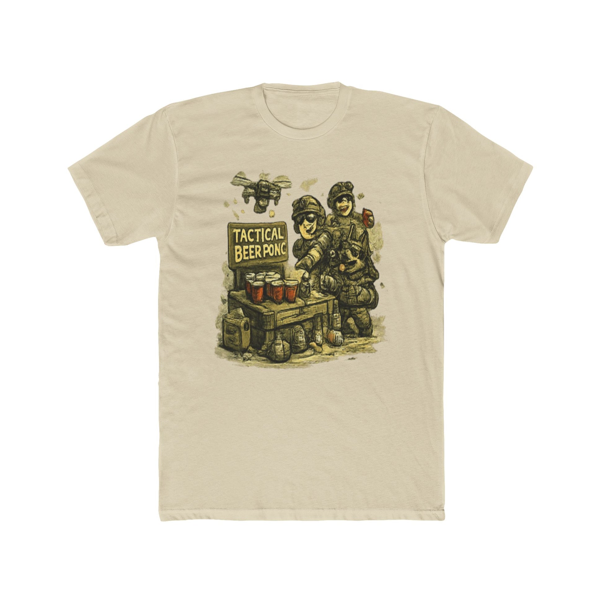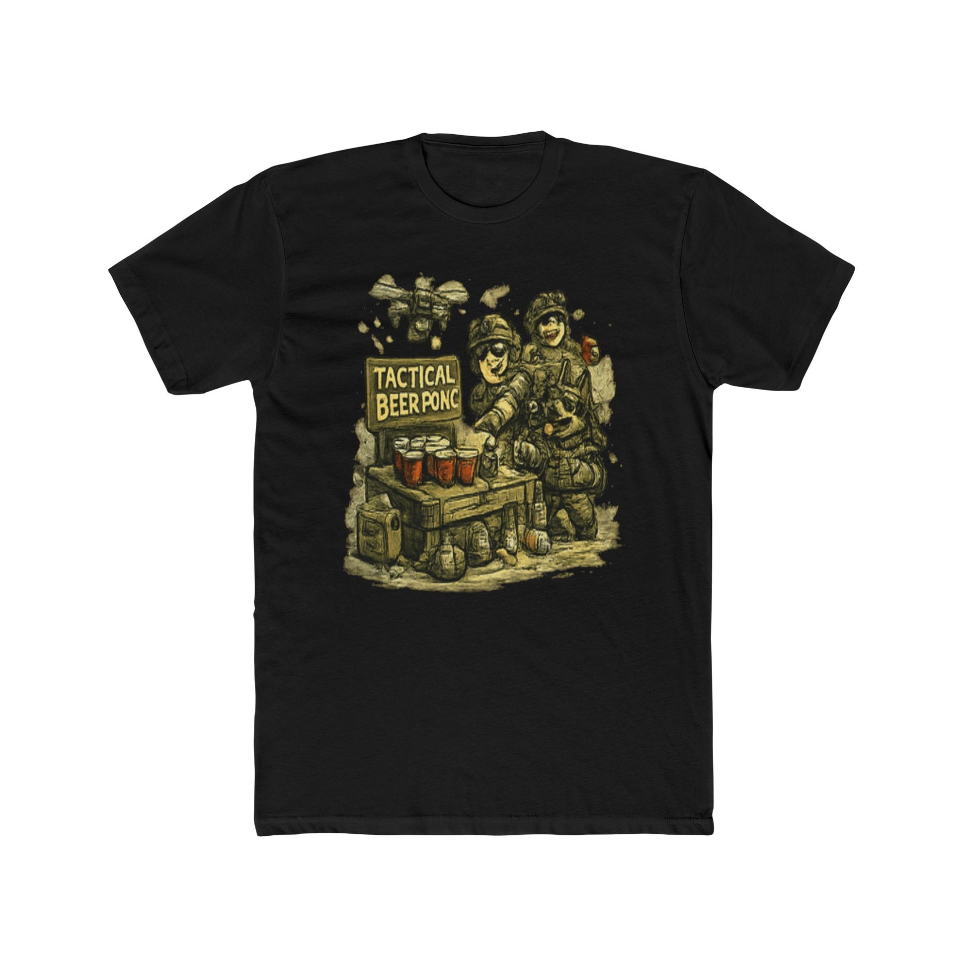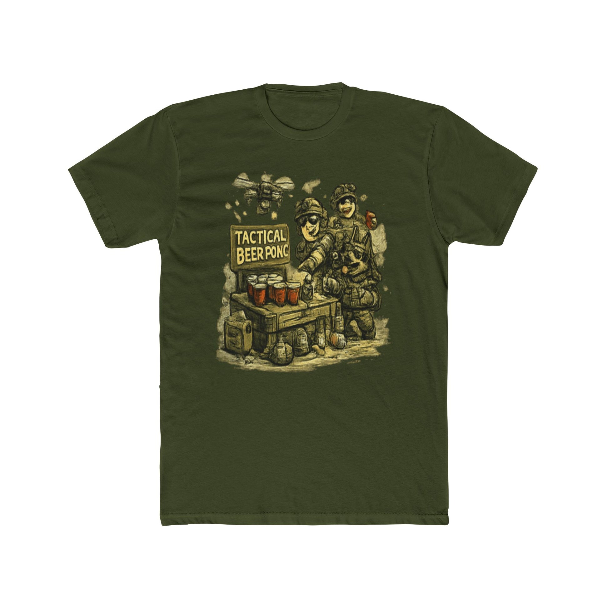 This vintage-style illustration depicts a humorous military scene titled "Tactical Beer Pong," featuring heavily armored soldiers gathered around a wooden table. The image showcases three main soldiers in full tactical gear and protective headwear, with additional figures visible in the background, all rendered in a retro pixel-art or woodcut aesthetic. Three beer glasses are prominently displayed on the table as the central focus of the composition. The artwork combines military imagery with recreational beer pong gaming in a satirical manner, employing a grainy, textured illustration style reminiscent of classic military propaganda or retro video game graphics. The overall design creates a comedic juxtaposition between serious military operations and casual leisure activities.