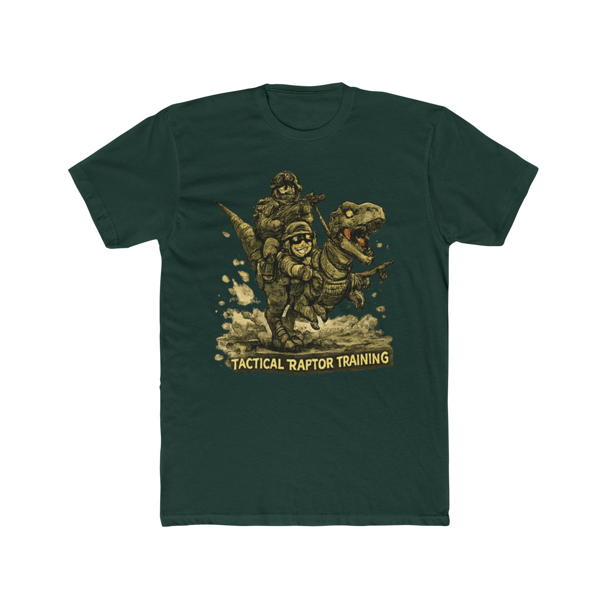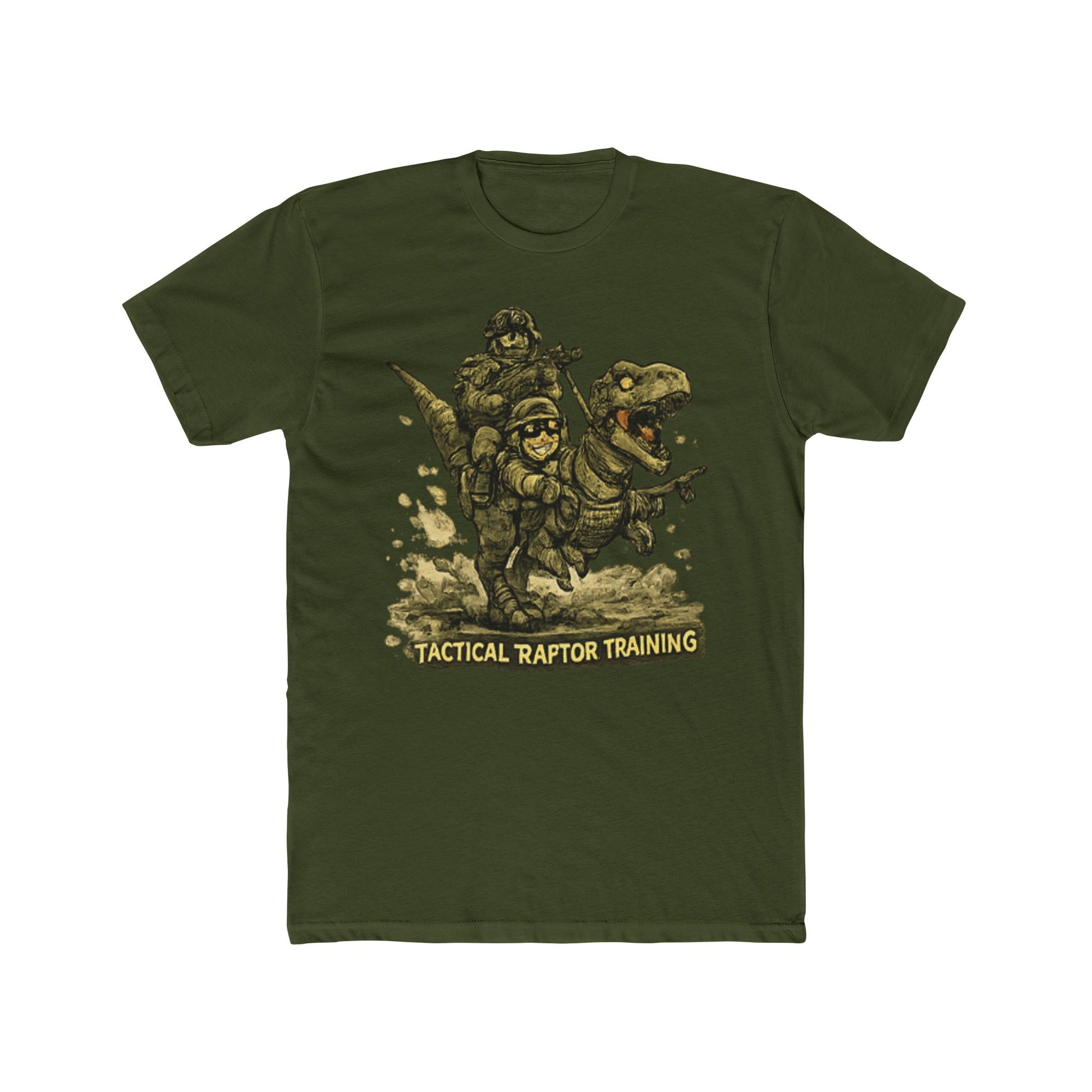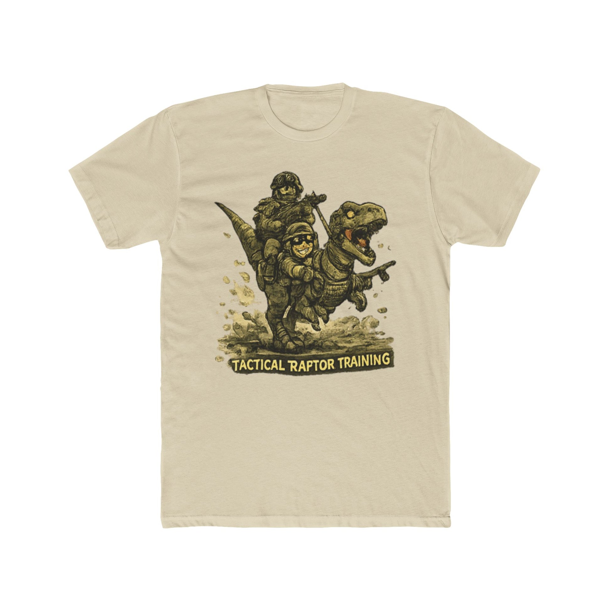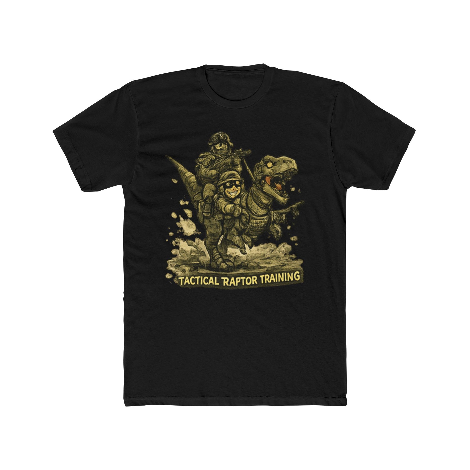 This image features a detailed illustration of a military soldier in tactical gear engaged in "Tactical Raptor Training," as indicated by the text at the bottom. The artwork depicts a heavily armed and armored figure in a dynamic action pose, holding weapons and wearing combat equipment typical of special forces or elite military units. The illustration style is rendered with a textured, engraved appearance that gives it a vintage or emblem-like quality, similar to military patches or insignia designs. The soldier is shown in an aggressive, combat-ready stance with anatomical detail given to the musculature and equipment placement. Scattered debris and ground elements surround the figure, enhancing the sense of movement and tactical activity in the composition.