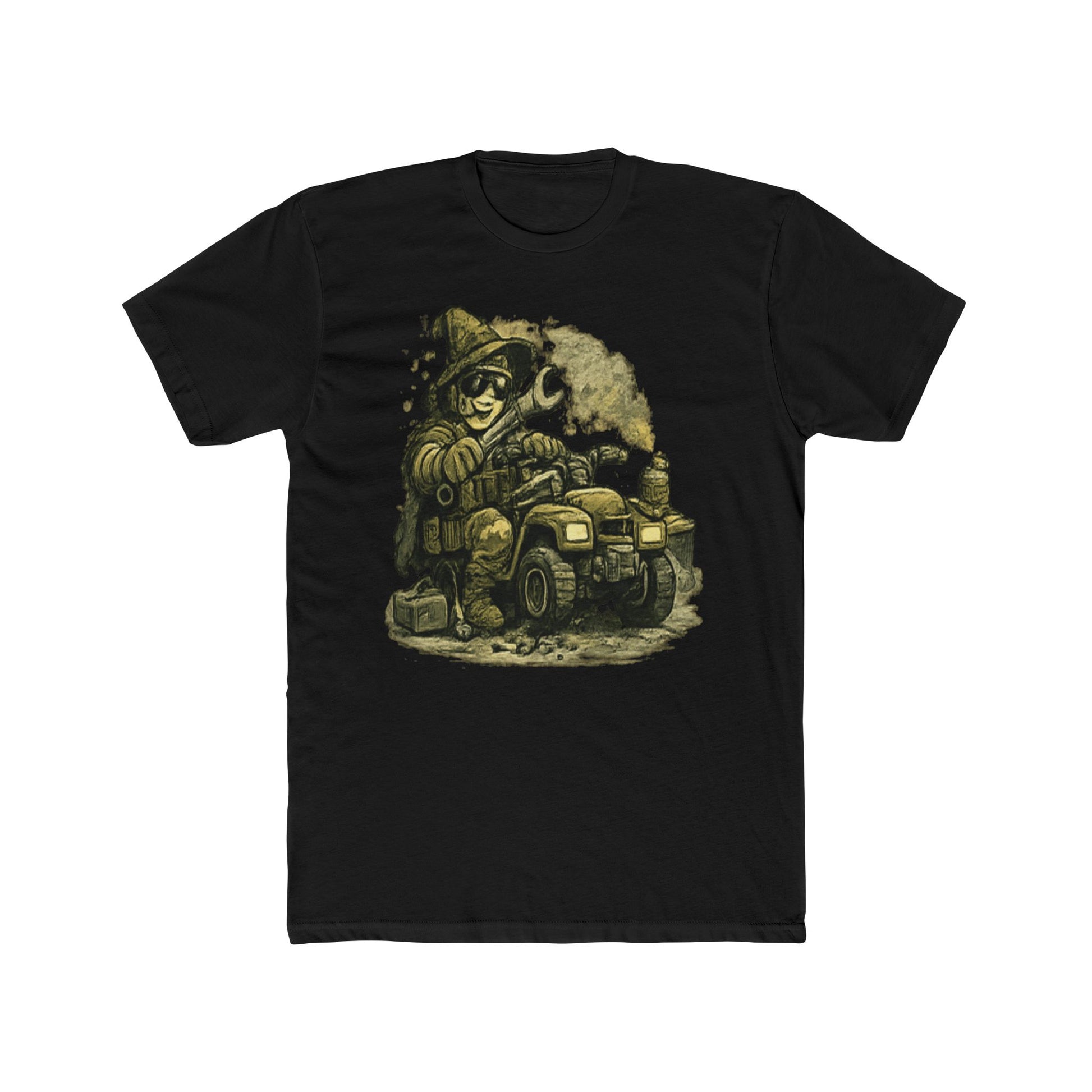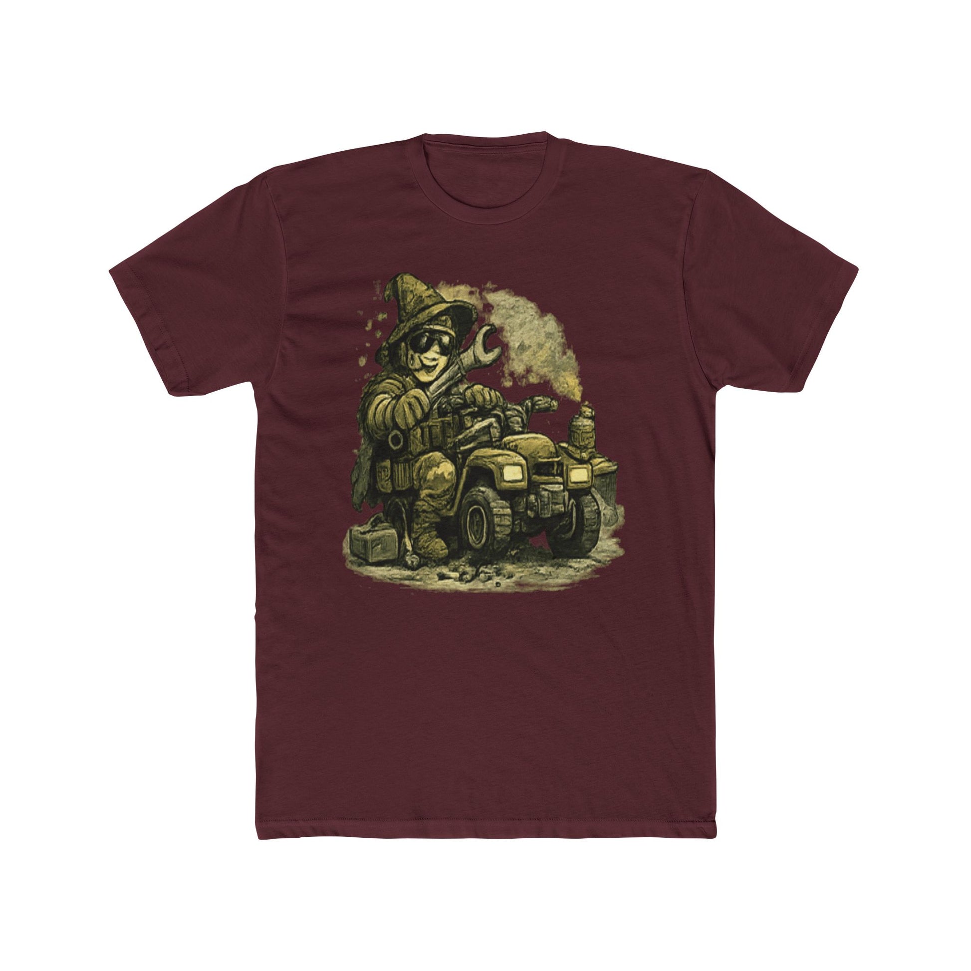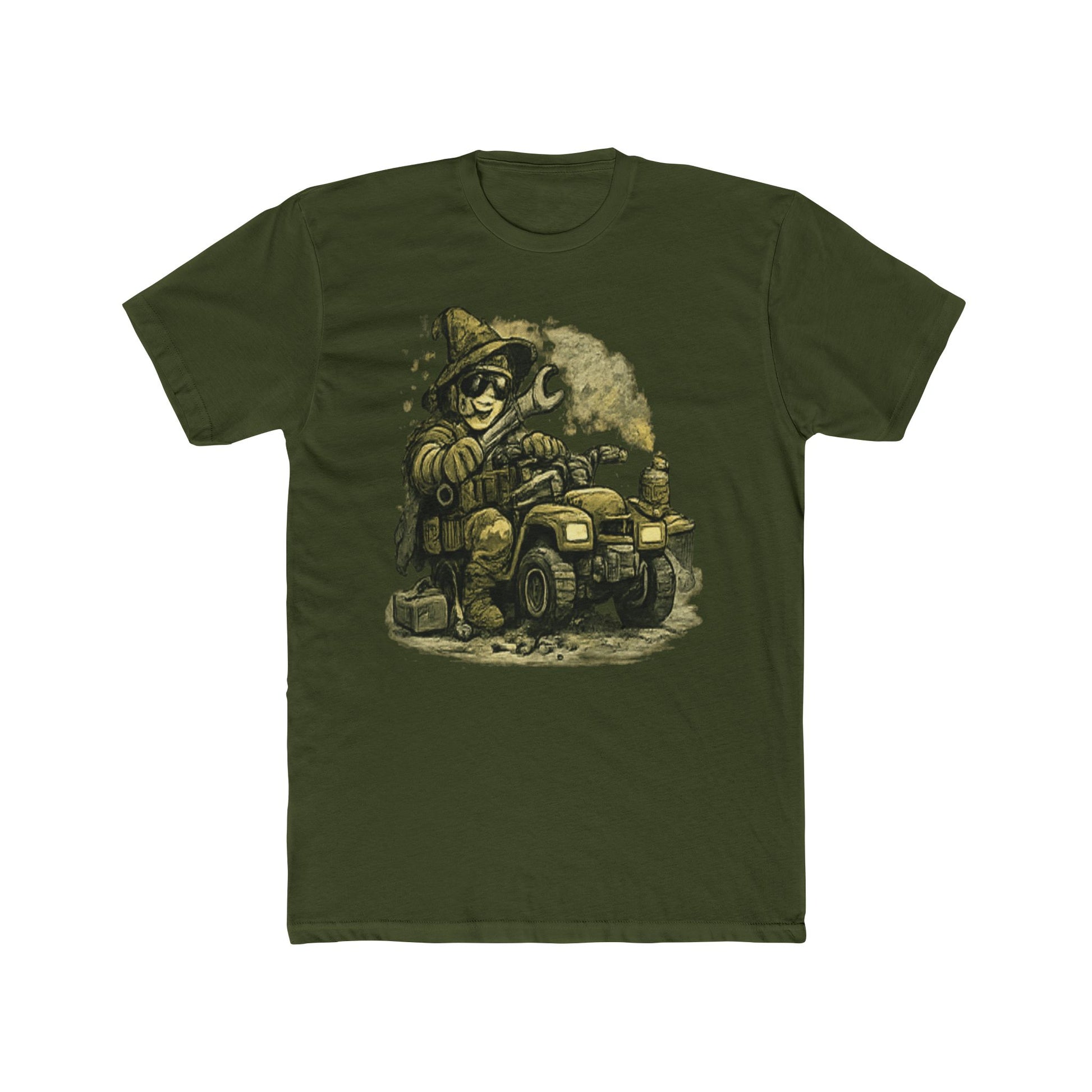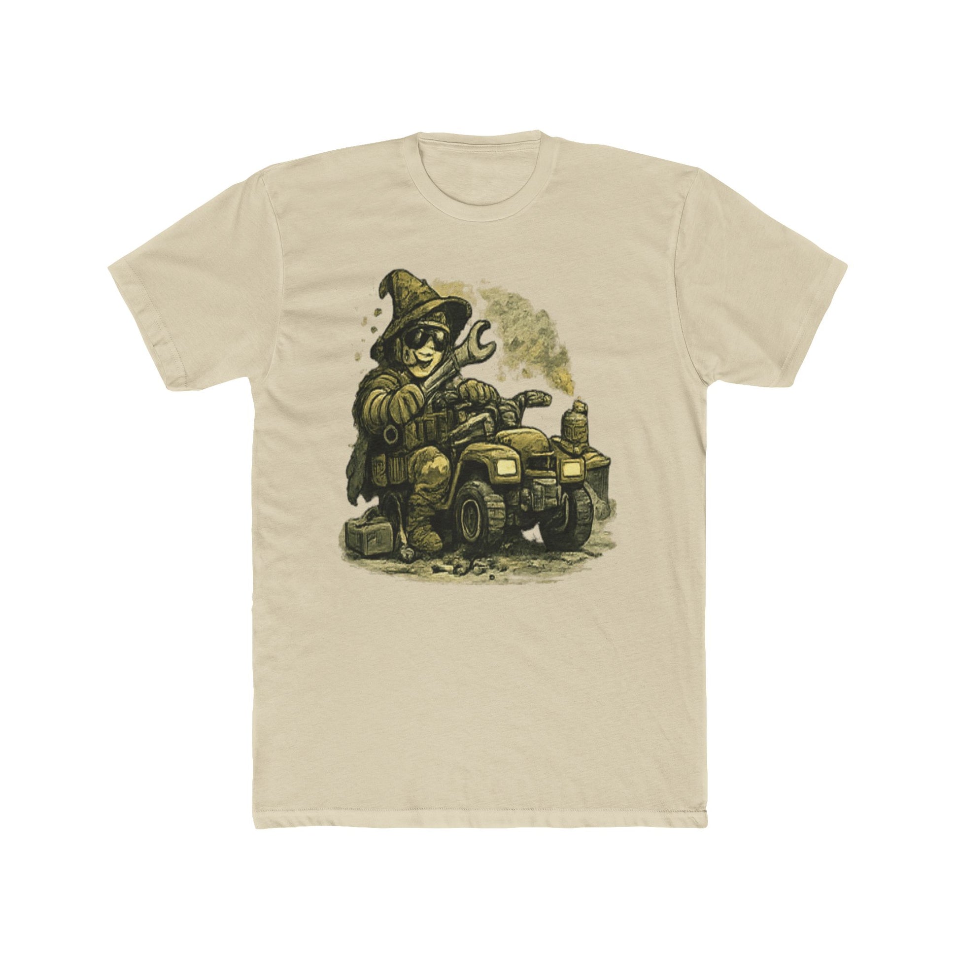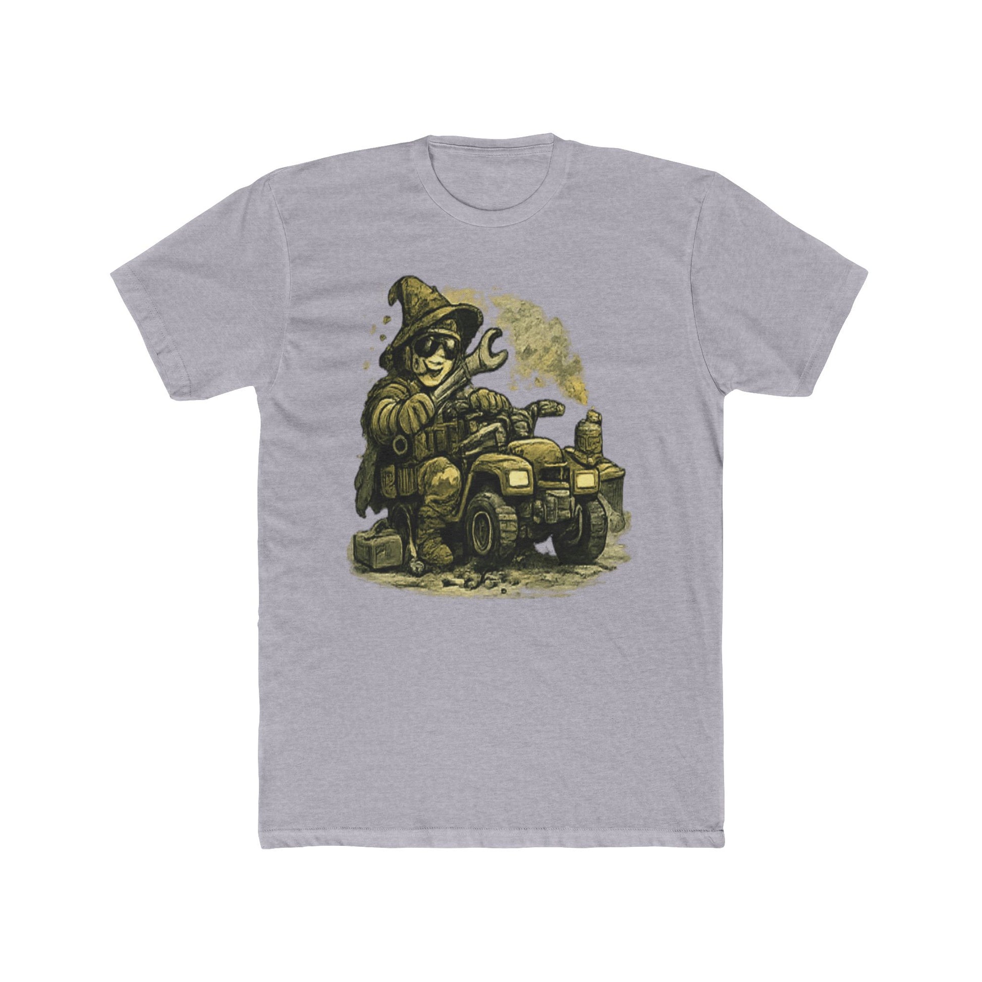 This illustration depicts a whimsical steampunk-themed scene featuring an anthropomorphic character seated in an elaborate mechanical vehicle or contraption. The image showcases intricate mechanical details including gears, pistons, wheels, and various industrial components arranged in a fantastical manner. The artwork employs a vintage engraving or etching style with detailed line work and cross-hatching techniques that create depth and texture throughout the composition. The character and machinery are rendered with meticulous craftsmanship, displaying the Victorian-era aesthetic combined with imaginative engineering elements. The overall composition presents a playful interpretation of retro-futuristic transportation design blended with nostalgic artistic elements.