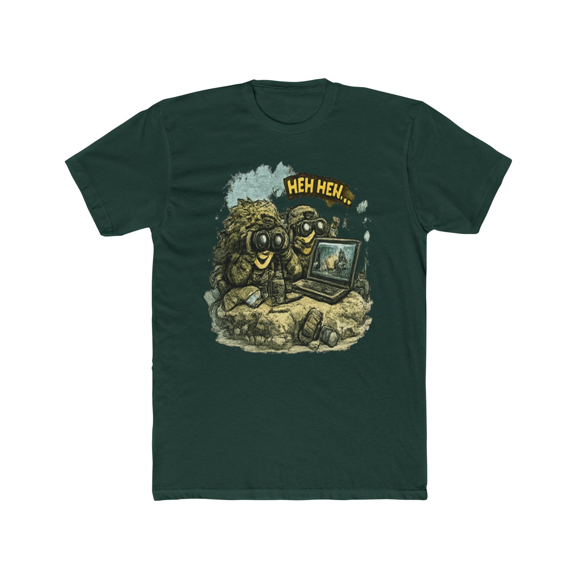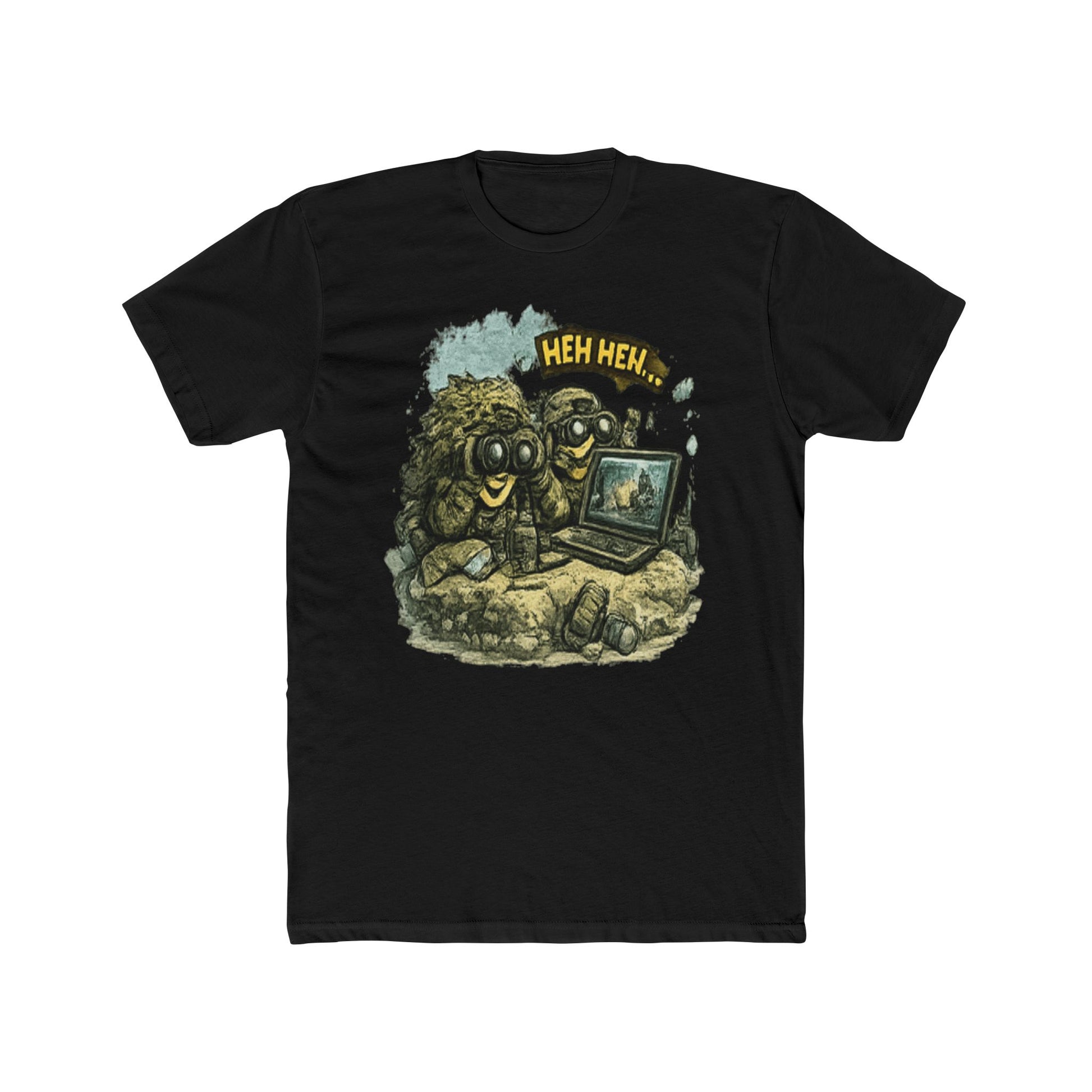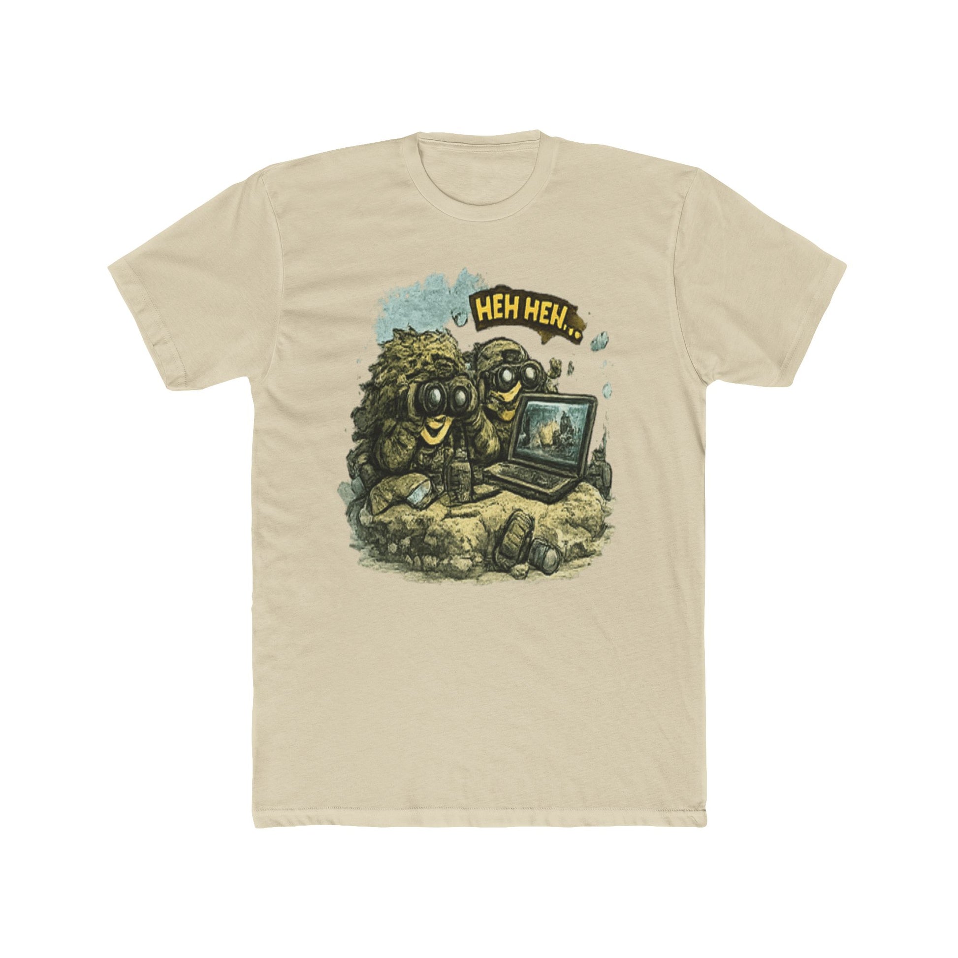 This retro-style pixel art image depicts two troll-like creatures sitting together while examining a laptop computer. The characters feature exaggerated facial features with large, prominent eyes and wide grins, displaying a humorous and mischievous demeanor. Both creatures have a hairy, organic appearance rendered in a classic 8-bit or early digital art style reminiscent of vintage computer graphics. The scene includes sandy terrain at the bottom and scattered rocks or debris throughout the composition, suggesting an outdoor or underground setting. Text reading "HEH HEH HEH" appears at the top of the image, emphasizing the comical and playful nature of the artwork.