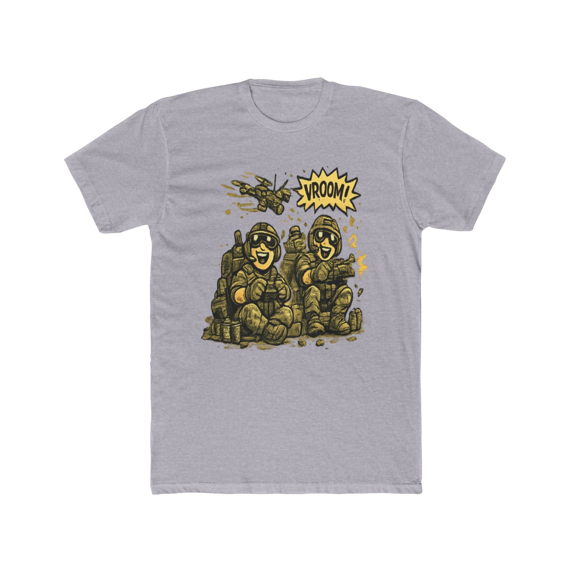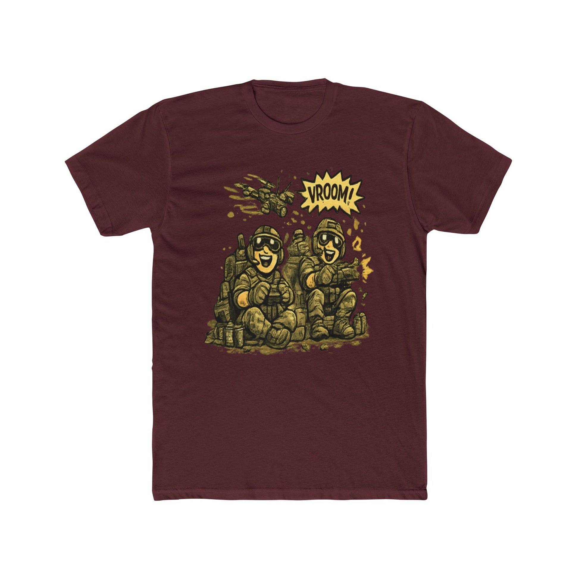 This retro-style comic book illustration depicts two animated characters wearing military or tactical gear and aviator sunglasses, celebrating with enthusiastic expressions and raised fists. The image features bold outlines and a classic comic book aesthetic, reminiscent of vintage action comics or video game graphics. A yellow starburst banner reading "VROOM7" appears prominently in the upper right corner, emphasizing the playful, dynamic nature of the scene. The characters are surrounded by motion effects and debris, suggesting action and excitement. The overall art style combines comic book illustration techniques with nostalgic 8-bit or 16-bit era gaming influences.